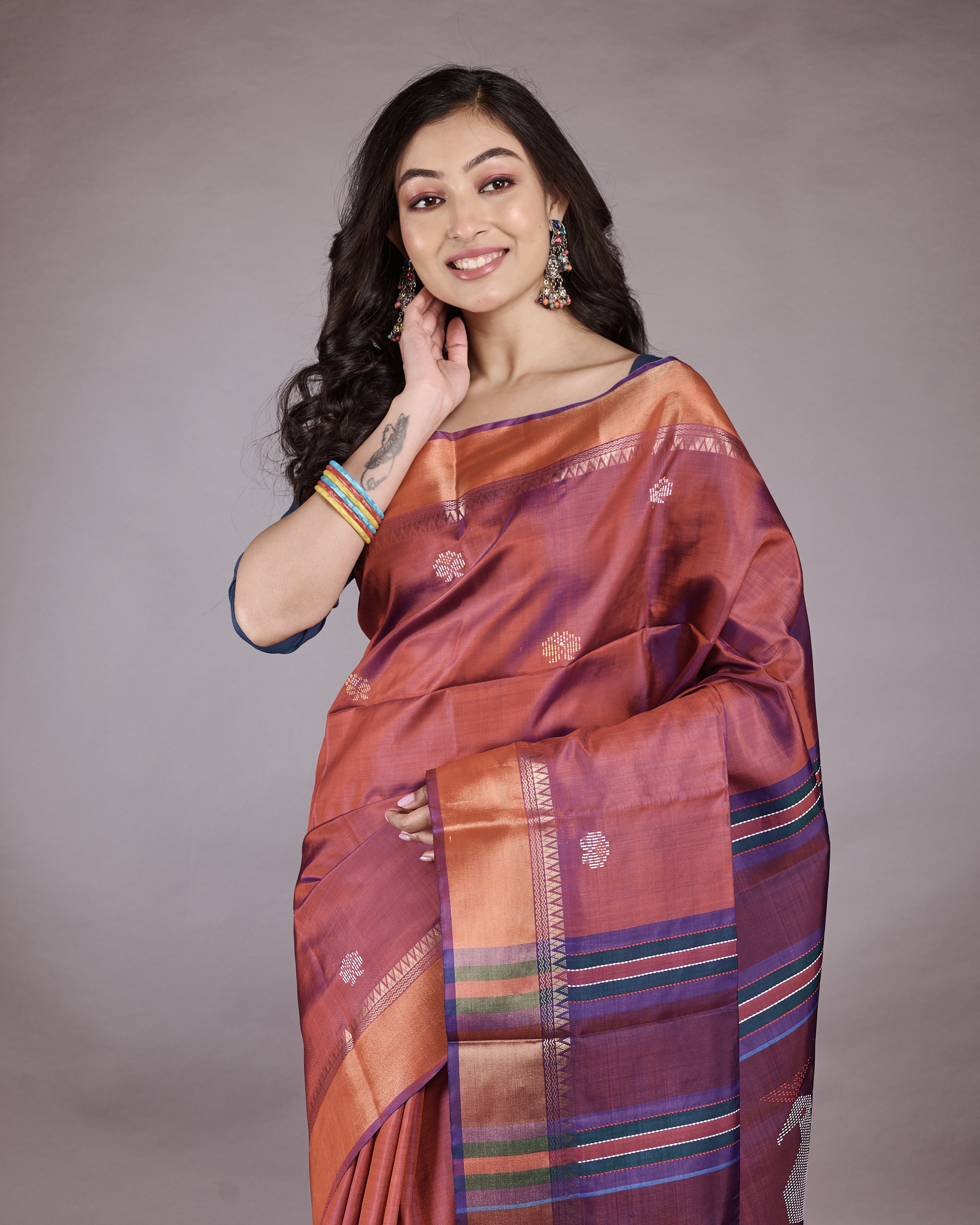 The intricate woven design, meticulously crafted by skilled artisans, showcases a perfect blend of traditional artistry and modern elegance. The vibrant colors and delicate motifs weave together a captivating pattern that adds sophistication to your look. Whether you’re attending a wedding, festival, or formal event, this saree is the ultimate statement of refined style.