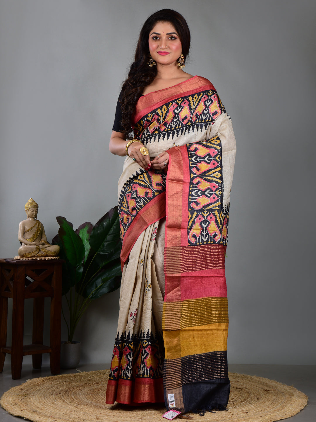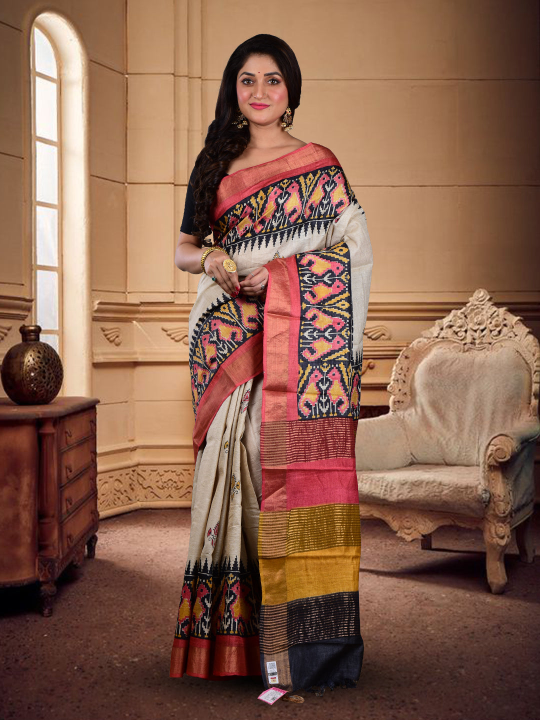 Resham Shilpi Exclusive Block Printed Tussar Saree with Zari Border