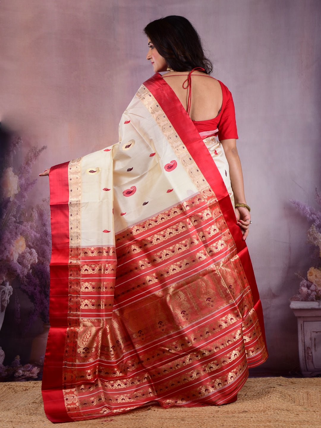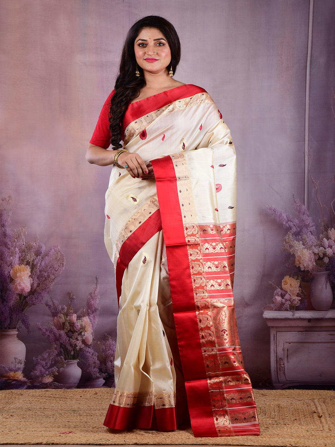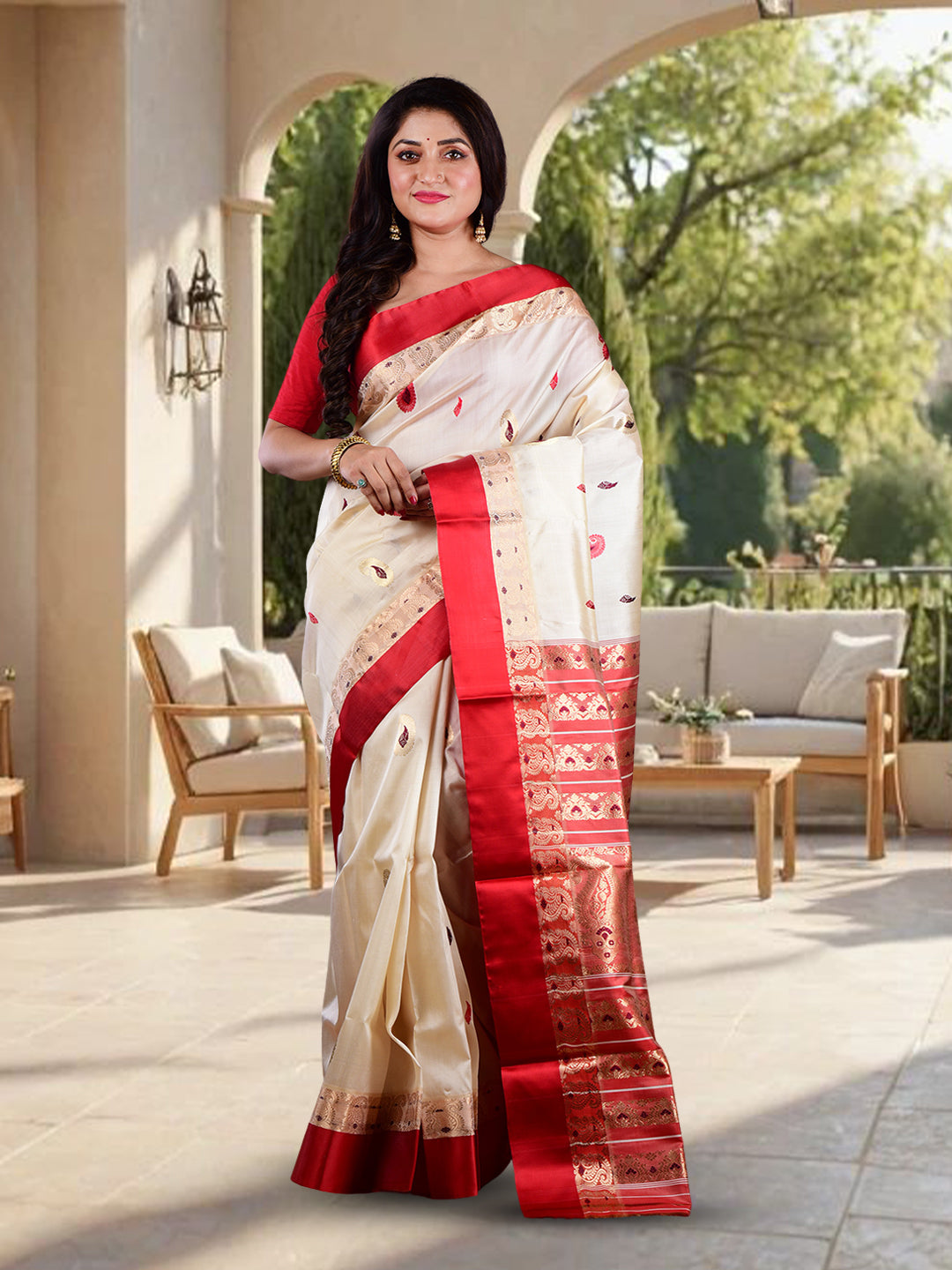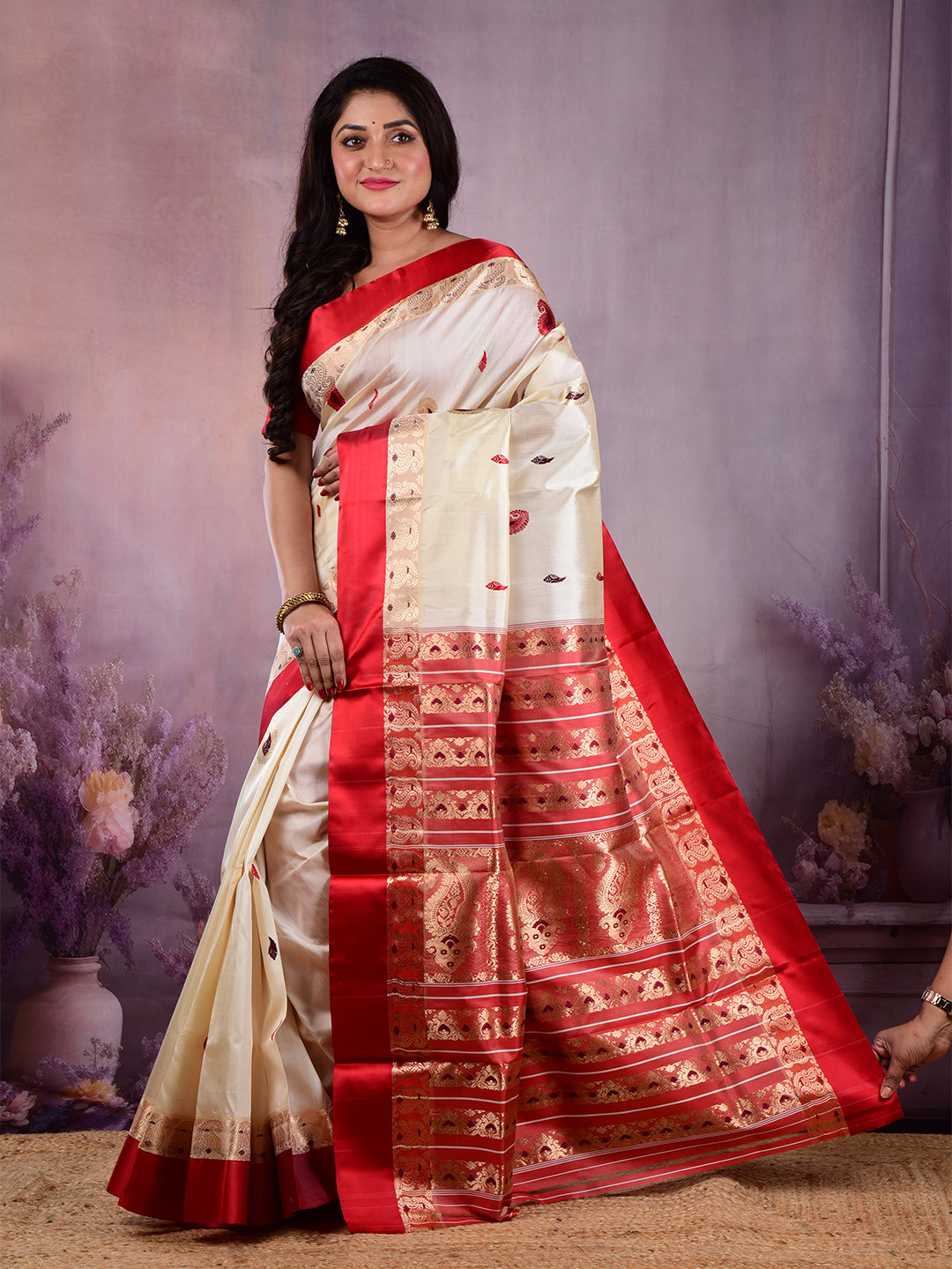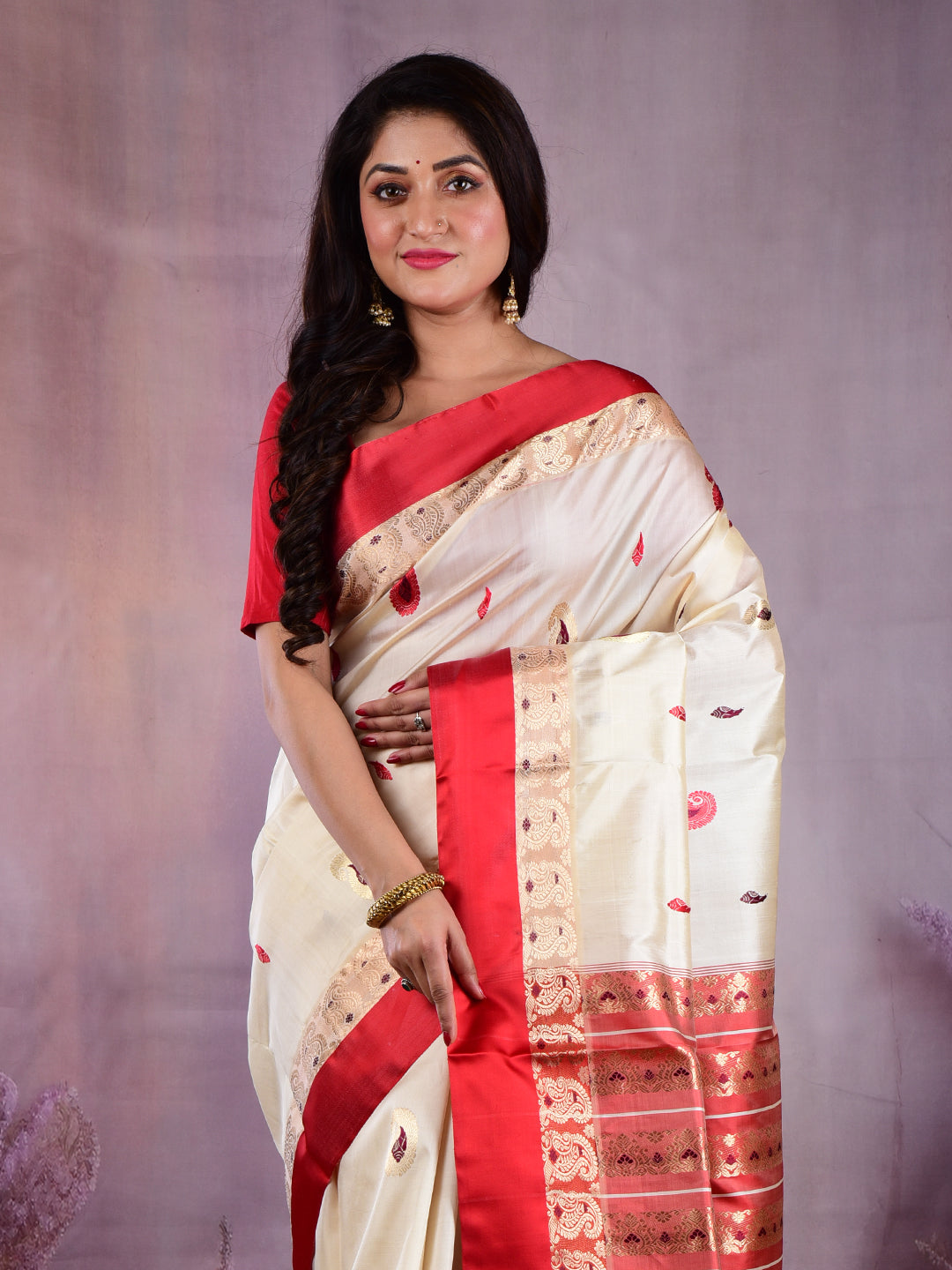 Step into timeless tradition with the Resham Shilpi Exclusive Handwoven Garad Silk Saree – a masterpiece of Bengal’s rich textile heritage. Crafted from pure silk, this saree embodies the serene charm of Garad weave, known for its pristine white base contrasted by vibrant red borders and pallu.