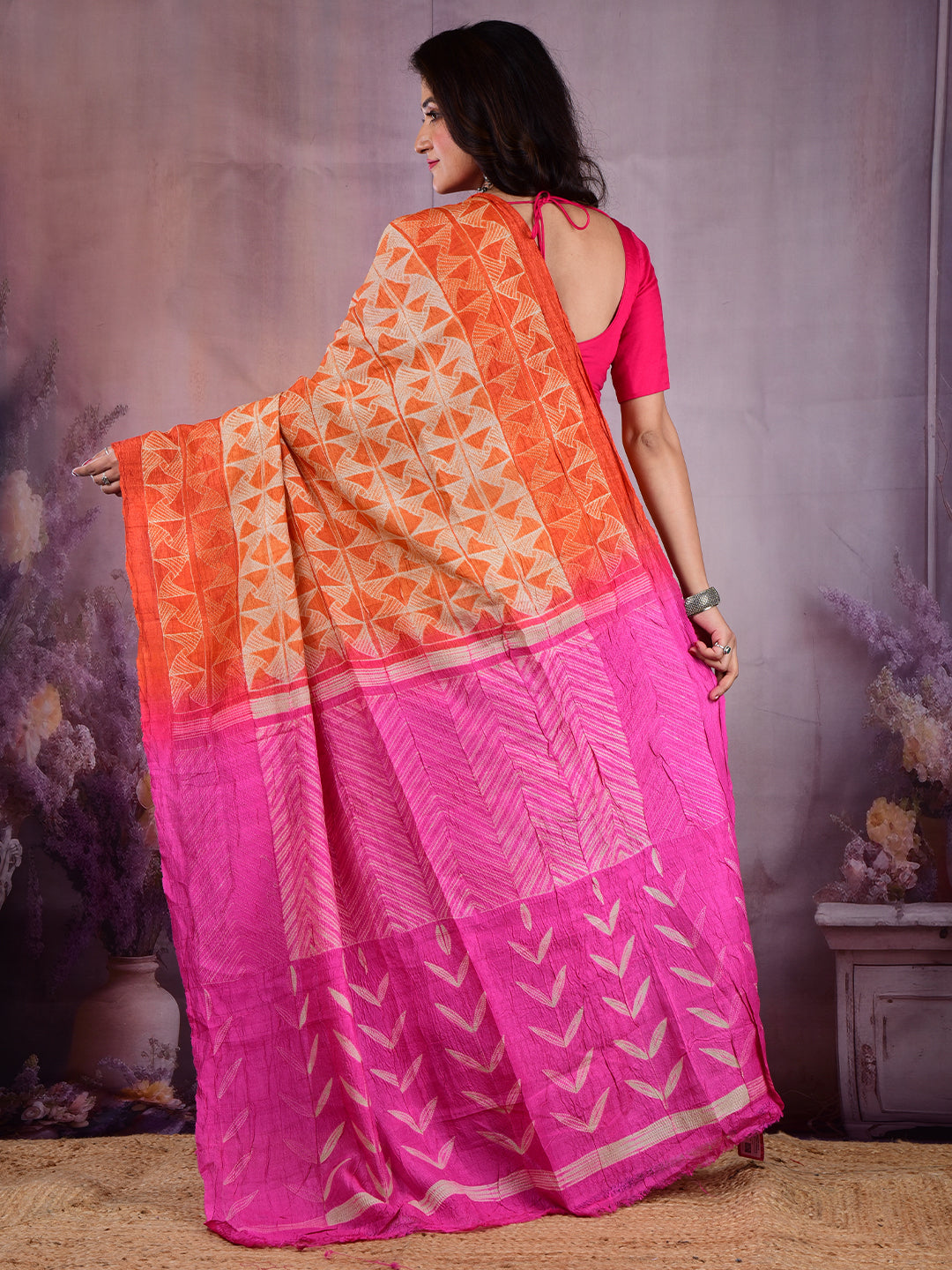 The rich, natural texture of Tussar silk combined with the dynamic Shibori designs gives this saree a luxurious feel and a visual appeal that is both bold and graceful. The unique patterns, created through the meticulous process of hand-dyeing, ensure that each saree is as unique as the wearer. Whether in shades of indigo, muted pastels, or vibrant hues, the saree offers versatility to match any celebration or event.